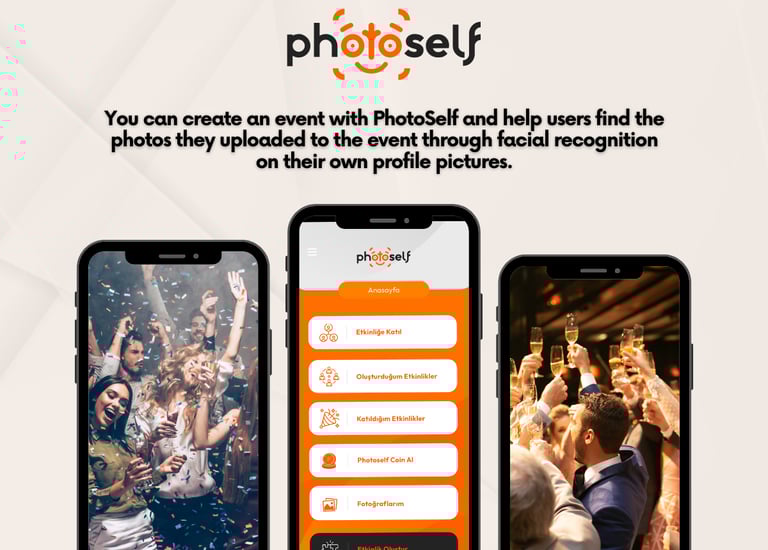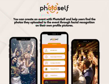 PhotoSelf ile bir etkinlik olusturabilir, etkinlige yüklediginiz fotografları kullanıcıların kendi profil fotografları üzerinden yüz tanıma ile bulmalarına yardımcı olabilirsiniz.